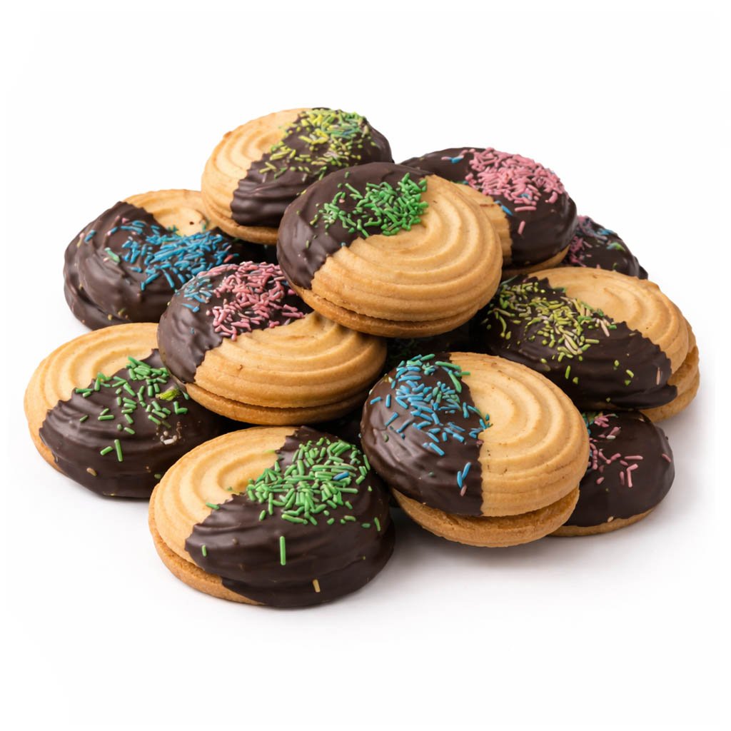 I biscotti rotondi glassati sono un dolce artigianale ispirato alla più autentica tradizione siciliana, preparato con ingredienti selezionati e lavorati con cura per offrire un prodotto dal gusto ricco, fragrante e piacevolmente avvolgente. Simili agli amati biscotti della pasticceria classica siciliana, si distinguono per la loro forma rotonda, la consistenza friabile e la caratteristica copertura di cioccolato, arricchita da una decorazione colorata che li rende ancora più invitanti e riconoscibili.